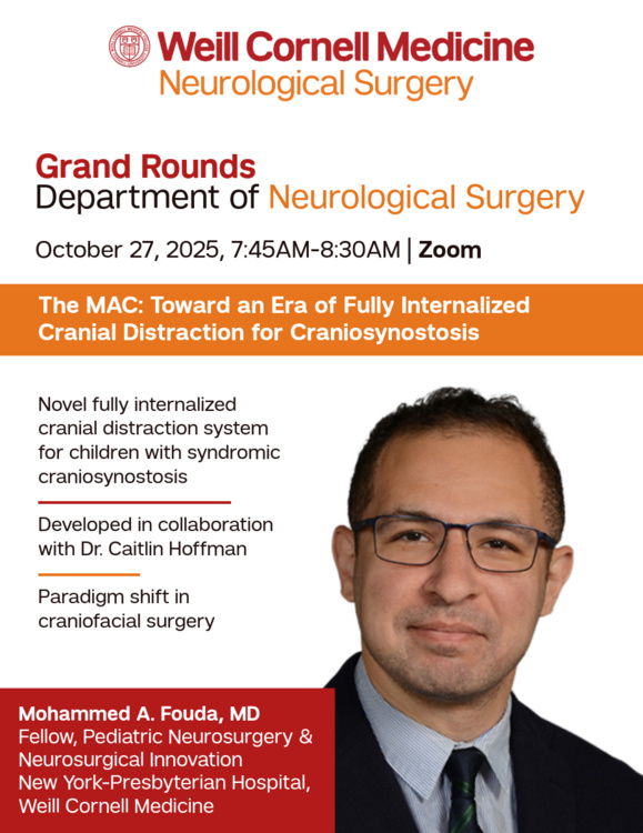 Dr. Mohammed Fouda will present a novel, fully internalized cranial distraction system for children with syndromic craniosynostosis. Developed in collaboration with Dr. Caitlin Hoffman, this device represents a potential paradigm shift in craniofacial surgery, using magnet actuation to safely initiate and maintain distraction while eliminating the need for external activation ports.